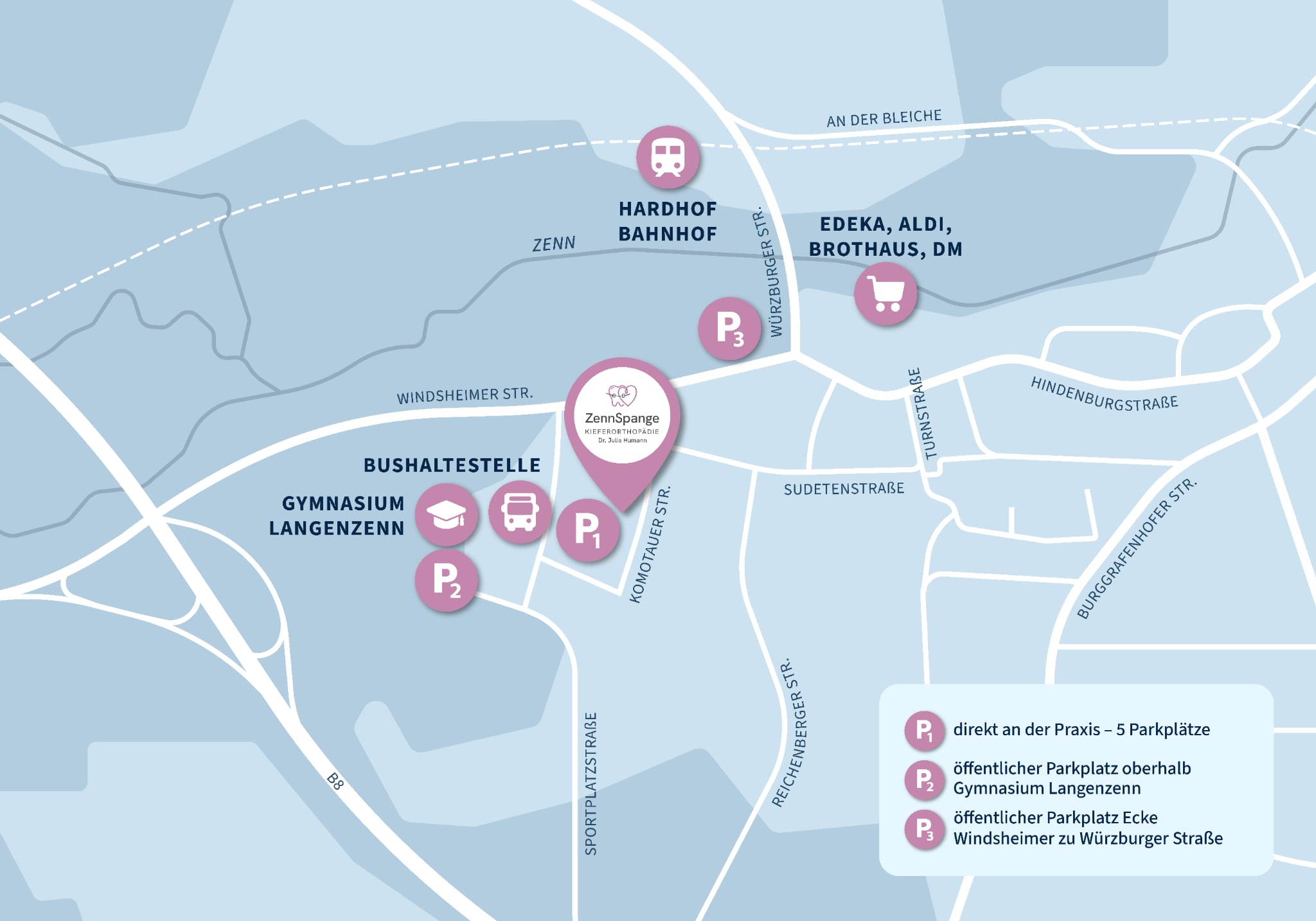 Die Praxis ist bequem mit Bus und Bahn erreichbar – ideal auch ohne Auto.